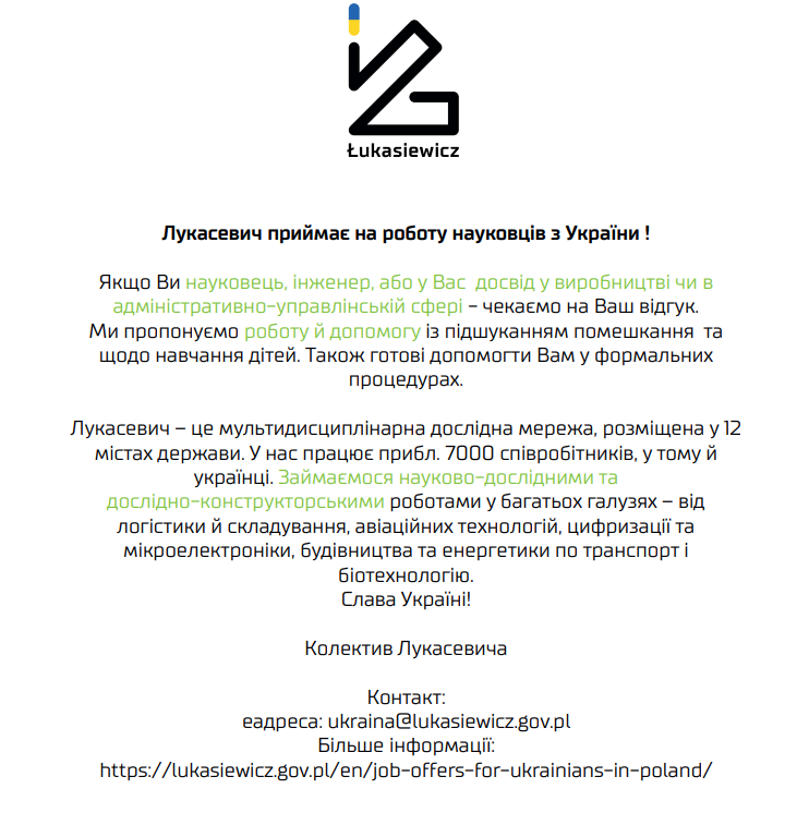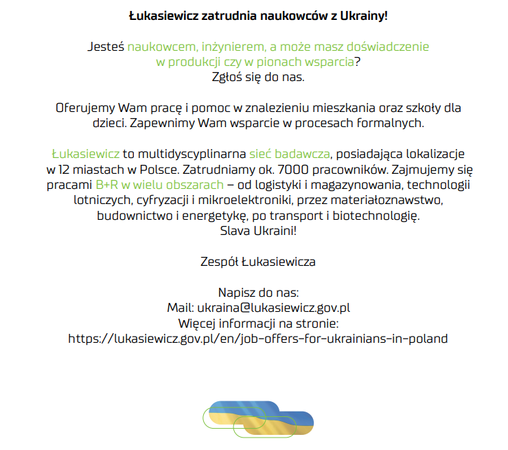 Лукасевич приймає на роботу науковцiв з України! | Łukasiewicz zatrudnia naukowców z Ukrainy!