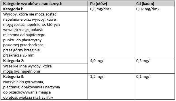 Zgodnie z dyrektywą Rady 84/500/EWG ilości ołowiu i kadmu uwalniane z wyrobów ceramicznych nie mogą przekraczać ustanowionych poniżej limitów: